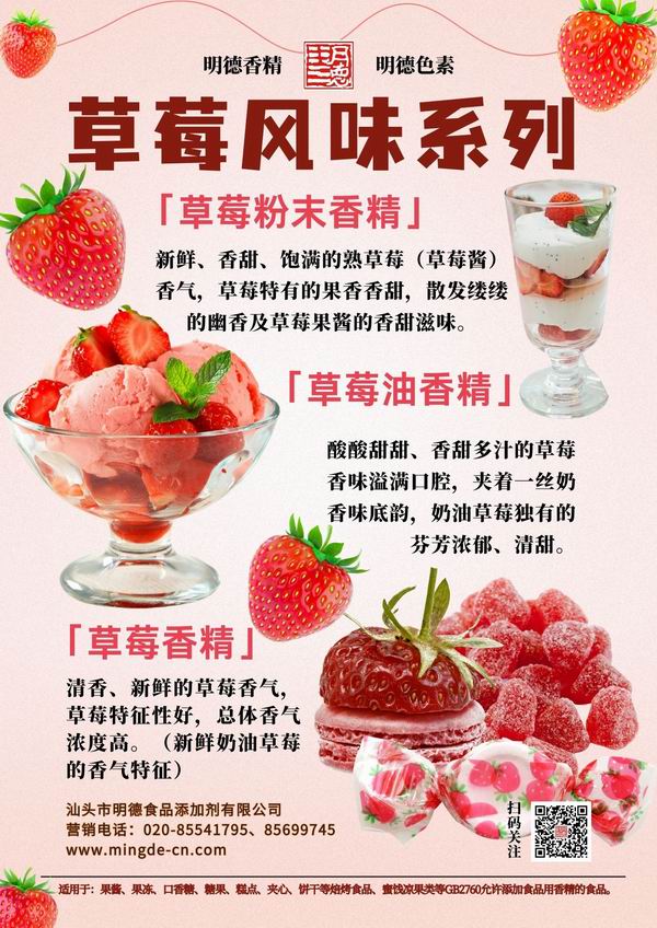 在草莓香精領域我們數十年潛心專研,迎合市場需求,滿足消費者喜好,汕頭市明德食品添加劑有限公司,推出了多種風味的草莓香精,如:草莓醬風味、奶油草莓風味、新鮮草莓風味、熟草莓風味等。