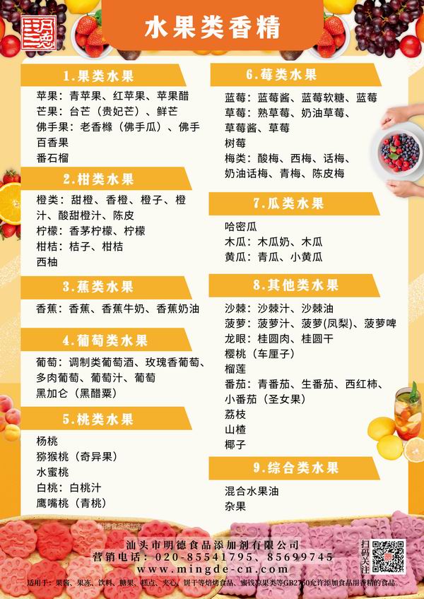 此外,汕頭市明德食品添加劑有限公司在數十年的研發中推出了眾多水果風味香精,從草莓、芒果、橙子 到 沙棘、佛手果、獼猴桃,應有盡有。歡迎廠家們了解嘗試~