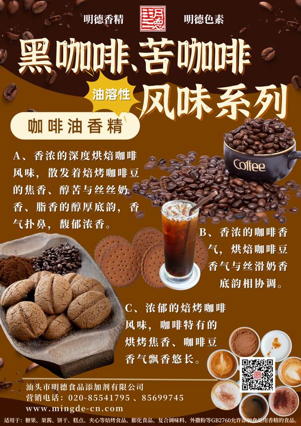 咖啡風味醇香濃厚、香氣濃郁、耐溫性好、性價比高。汕頭明德食品添加劑潛心研發出20余款咖啡香精,咖啡、齋啡、拿鐵、瑪奇朵等風味應有盡有,從液體到粉末,從水溶到油溶,任君選擇。<產品參數>