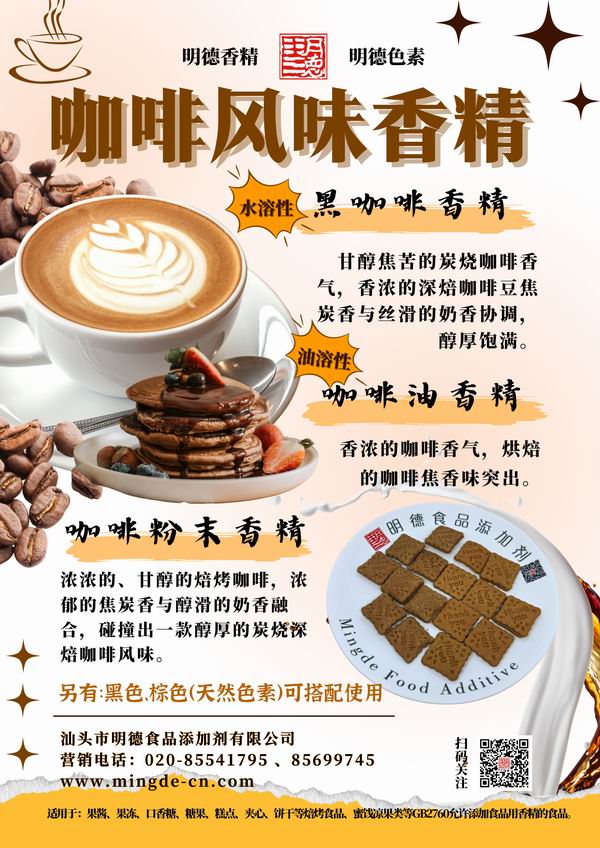 近年來,國內咖啡消費氛圍愈來愈濃,咖啡風味多元融入了各個領域,如 果凍、餅干、雪糕等,甚至應用于室內香氛等。順應市場潮流,提升味覺體驗。汕頭市明德食品添加劑有限公司不斷創新、潛心專研,當前我們擁有20余款咖啡相關風味的香精,供您選擇。并持續不斷創新,努力研發更多符合市場需求的風味。