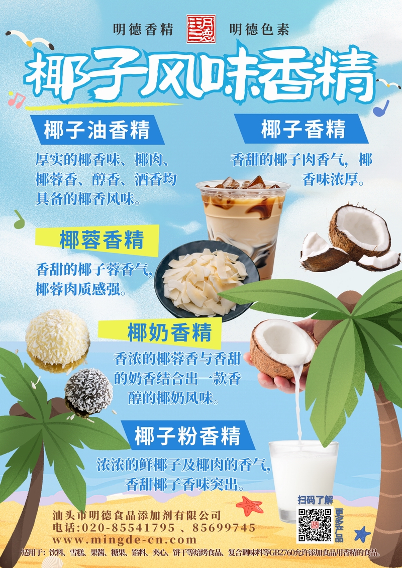 汕頭明德食品添加劑有限公司出品的椰子風味香精系列,融合椰子肉、椰漿、椰蓉等真實風味特征,開發出多款適用于飲品、烘焙、糖果、乳品及調味品行業的香精產品,助力食品工廠在配方中實現椰香濃郁、層次豐富、留香持久的使用效果。產品特點