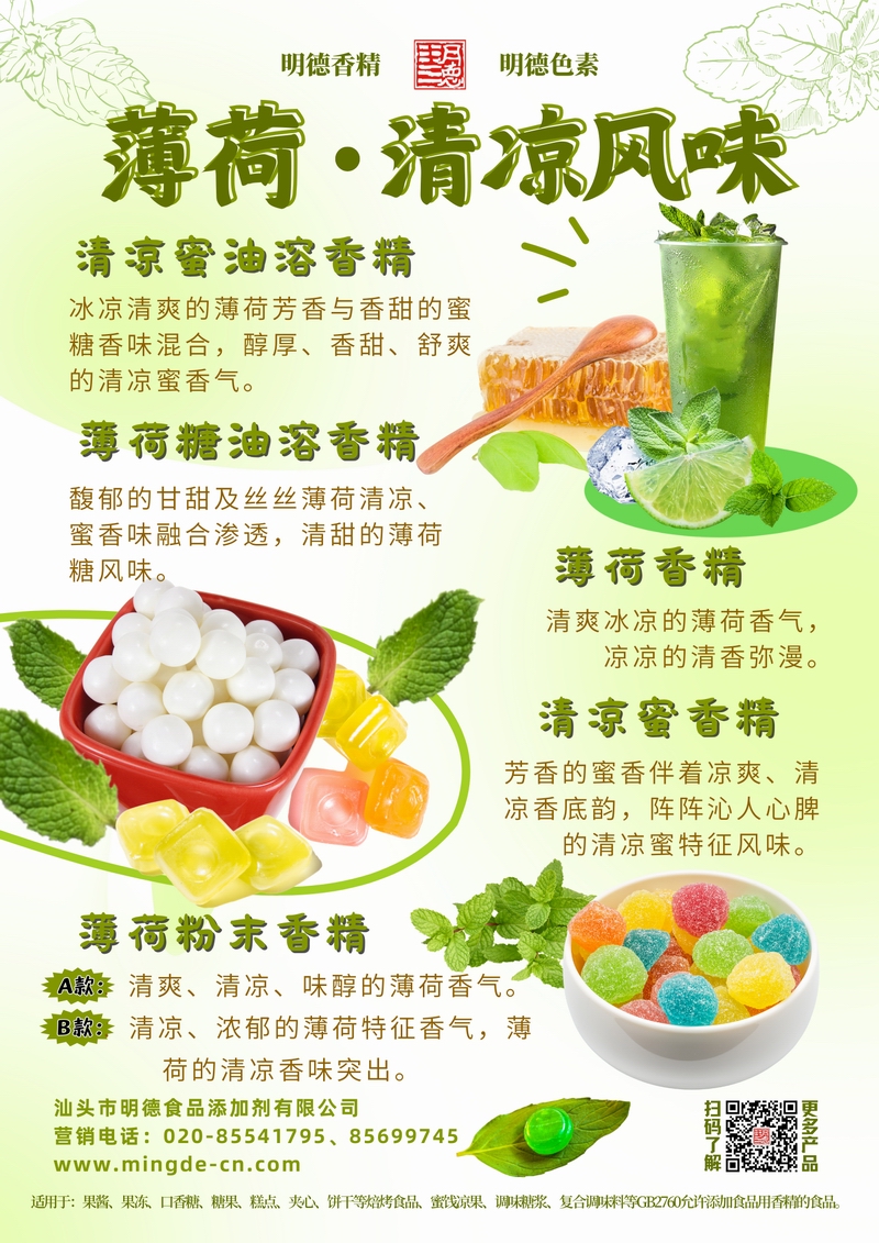 明德薄荷清涼風味香精 清涼薄荷 覆蓋糖果飲品場景汕頭市明德食品添加劑有限公司推出的薄荷·清涼風味香精系列,涵蓋清涼蜜油溶香精、薄荷糖油溶香精、薄荷香精、清涼蜜香精、薄荷粉末香精等多種調性。產品清涼舒爽、香氣真實,適用于糖果、飲料、口香糖、烘焙食品及復合調味等B端應用,幫助工廠快速打造沁人心脾的清涼薄荷風味。